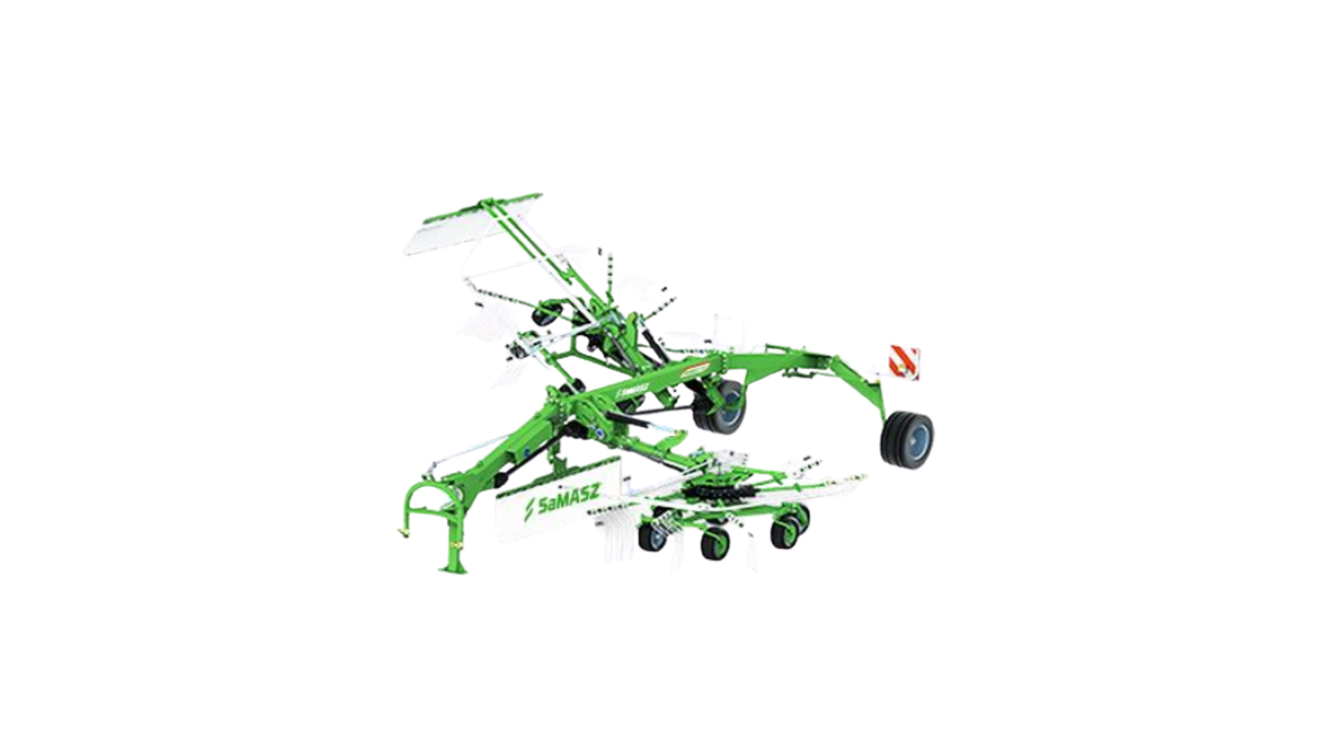 2 Rotores de 11 brazos Ajuste de trabajo con cilindros hidraulicos. Ruedas para transporte. Posibilidad de trabajar con 1 o 2 andanas. Doble cortina. Ancho de la andana regulable. Neumaticos bajo rotores 16x 6.50-8